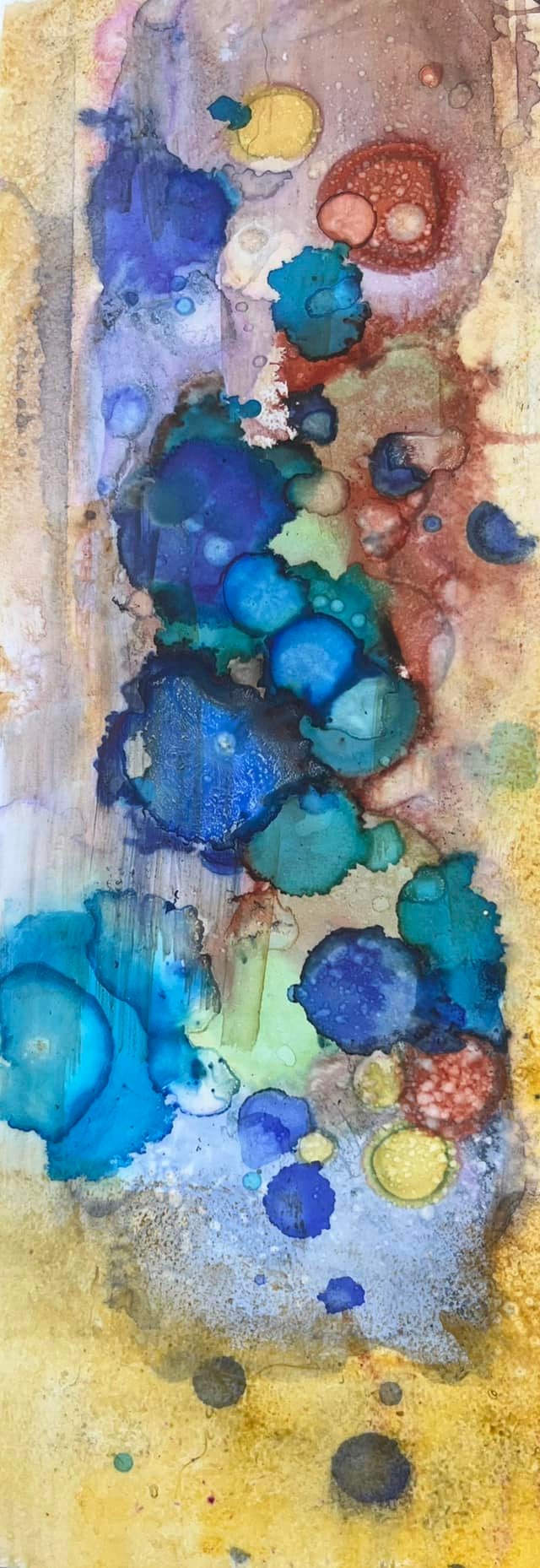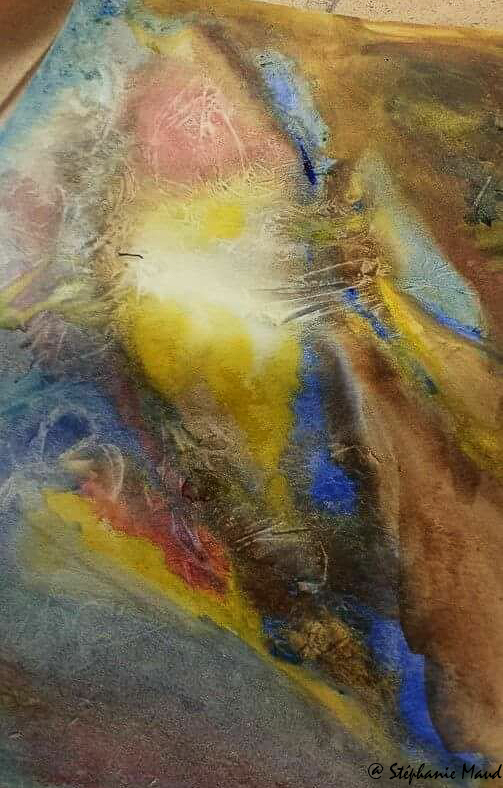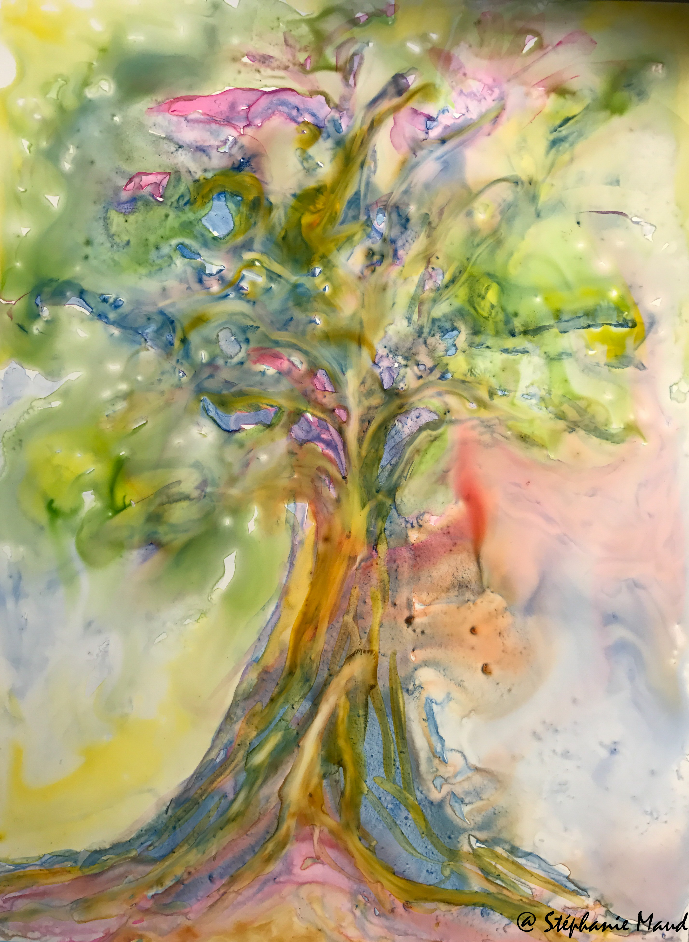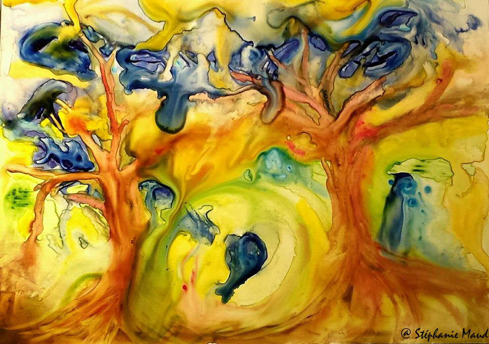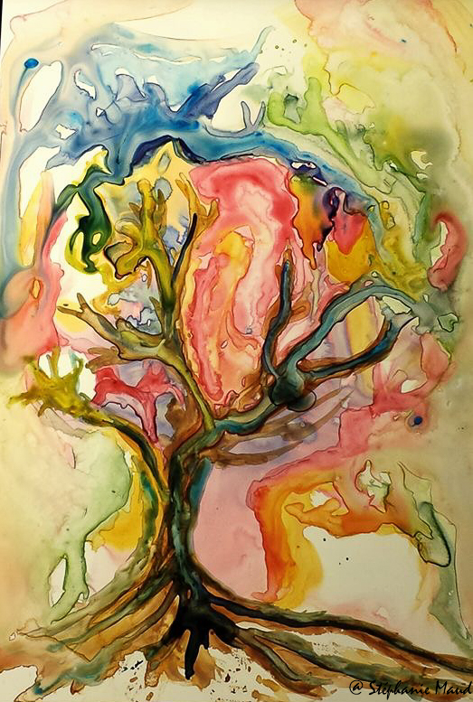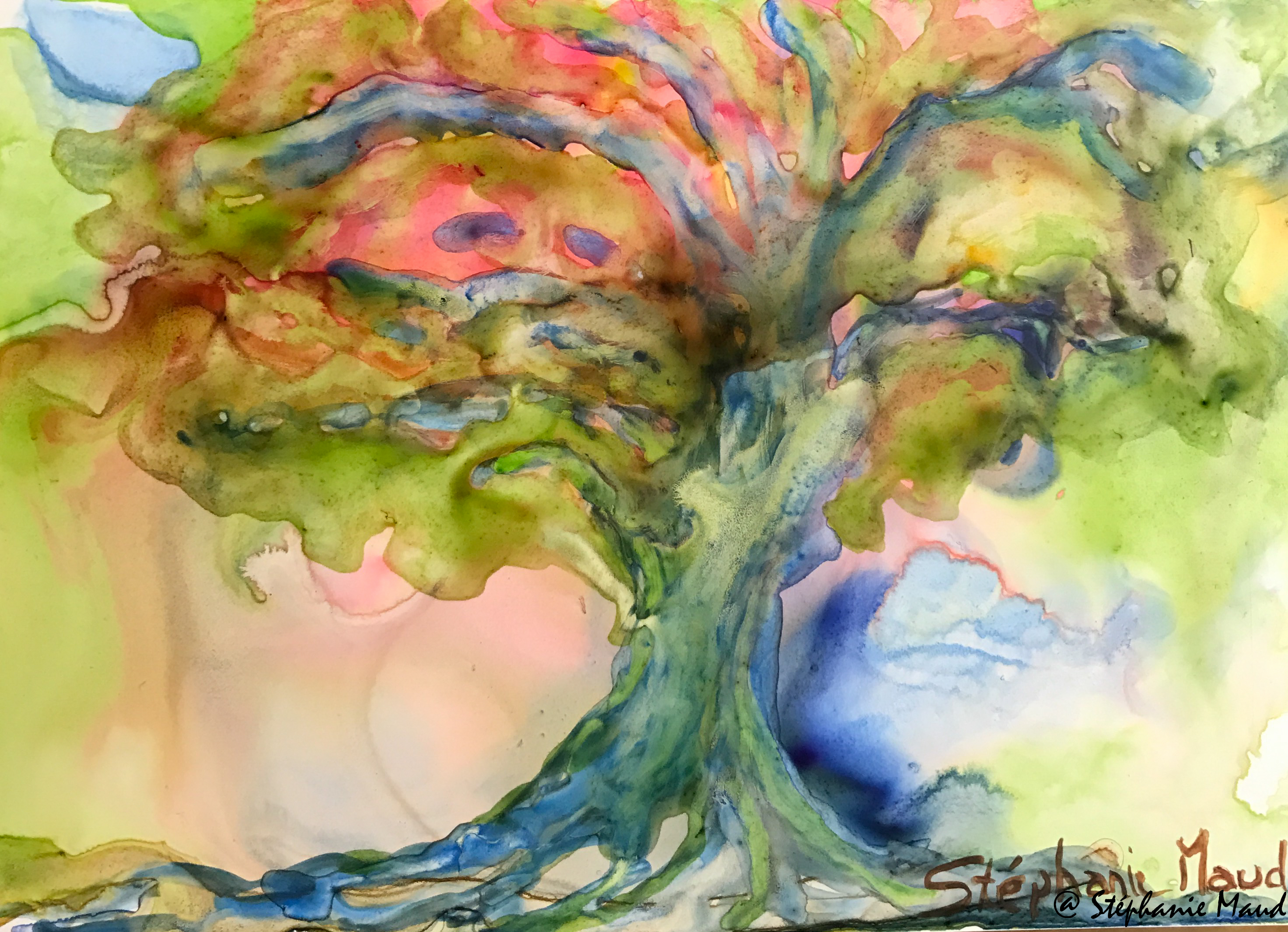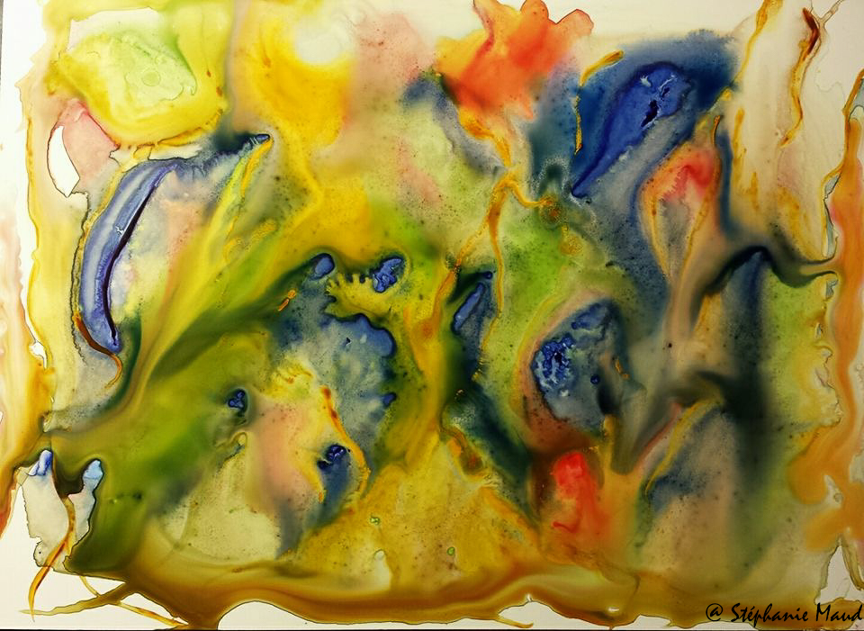 Sur papier Yupo, en utilisant l’eau, les couleurs et les mouvements j’exprime mes émotions, mes états d’âmes comme de l’art thérapie. J’évacue mes tensions, mes émotions plus fortes afin de m’en libérer. J’exprime aussi mes états de sérénité, mon monde intérieur rempli d’images, de couleurs, de mouvements et de symboles. Ma vie intérieure et ma vision de la Vie tel que mon parcours de Vie particulier l’a construit.
